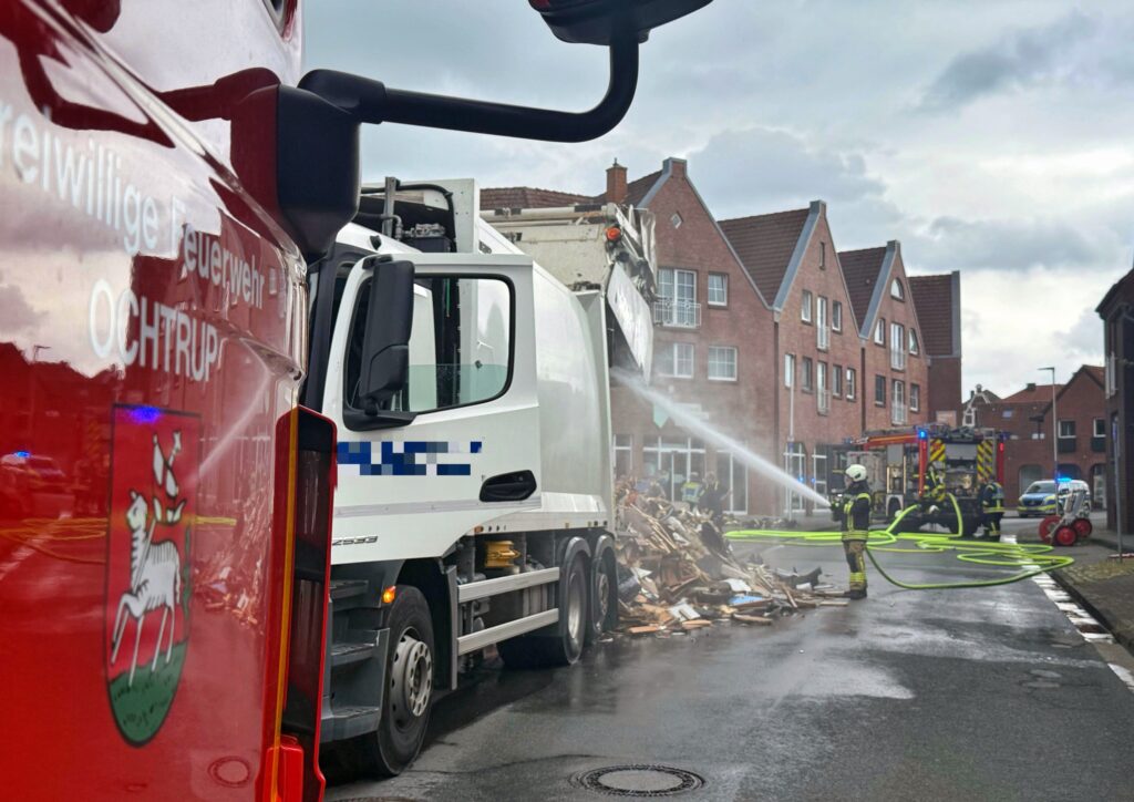 Am Freitagnachmittag wurde die Feuerwehr Ochtrup zum Marktplatz gerufen. Bereits seit einigen Tagen waren wieder Sperrmüllfahrzeuge im Stadtgebiet unterwegs, als gegen 13:22 Uhr der Fahrer eines der Fahrzeuge der Kreisleitstelle Steinfurt einen Brand im Inneren meldete. Die Feuerwehr rückte sofort aus und arbeitete eng mit der Fahrzeugbesatzung zusammen, um den Sperrmüll aus dem Fahrzeug zu entfernen. Anschließend wurde das entzündete Material auf der Straße von den Einsatzkräften sicher abgelöscht. Für die Dauer der Löscharbeiten musste der Bereich vorübergehend für den Durchgangsverkehr gesperrt werden.