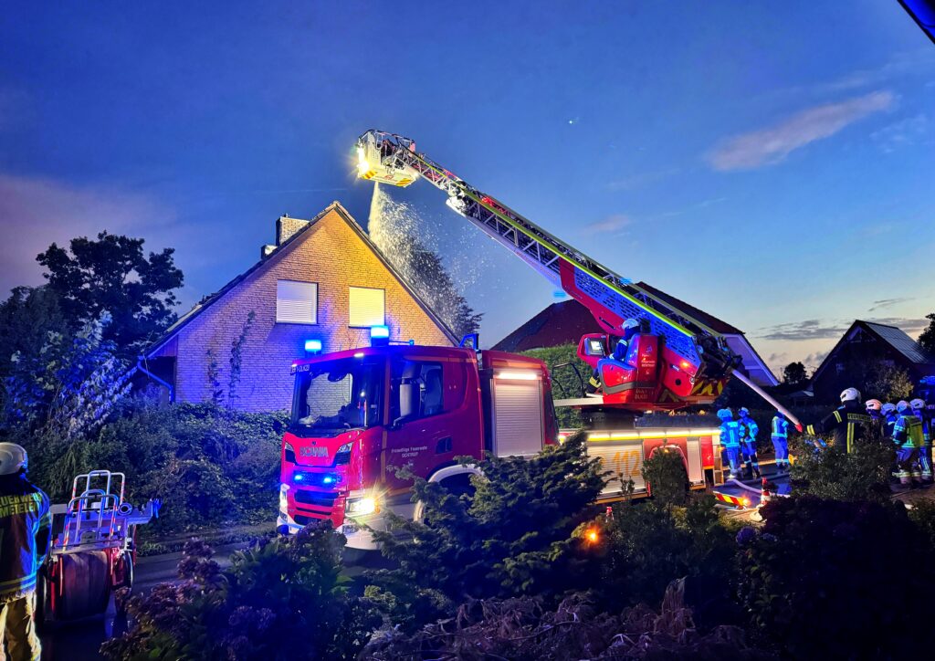 In den frühen Morgenstunden wurde die Feuerwehr Ochtrup im Rahmen der geplanten überörtlichen Hilfeleistung mit der Drehleiter zu einem Dachstuhlbrand in die Nachbargemeinde Metelen alarmiert. Im Bereich Kolpingstraße stand der Dachstuhl eines leerstehenden Einfamilienhauses nach ersten Meldungen in Vollbrand. Die Ochtruper Einsatzkräfte unterstützten die Löscharbeiten aus dem Drehleiterkorb und legten im Anschluss über den festverbauten Wassermonitor einen Schaumteppich über den ausgebrannten Dachstuhl, um eine erneute Entzündung zu verhindern. Nach rund 2,5 Stunden konnte der Einsatz für die Ochtruper Kräfte erfolgreich beendet werden.