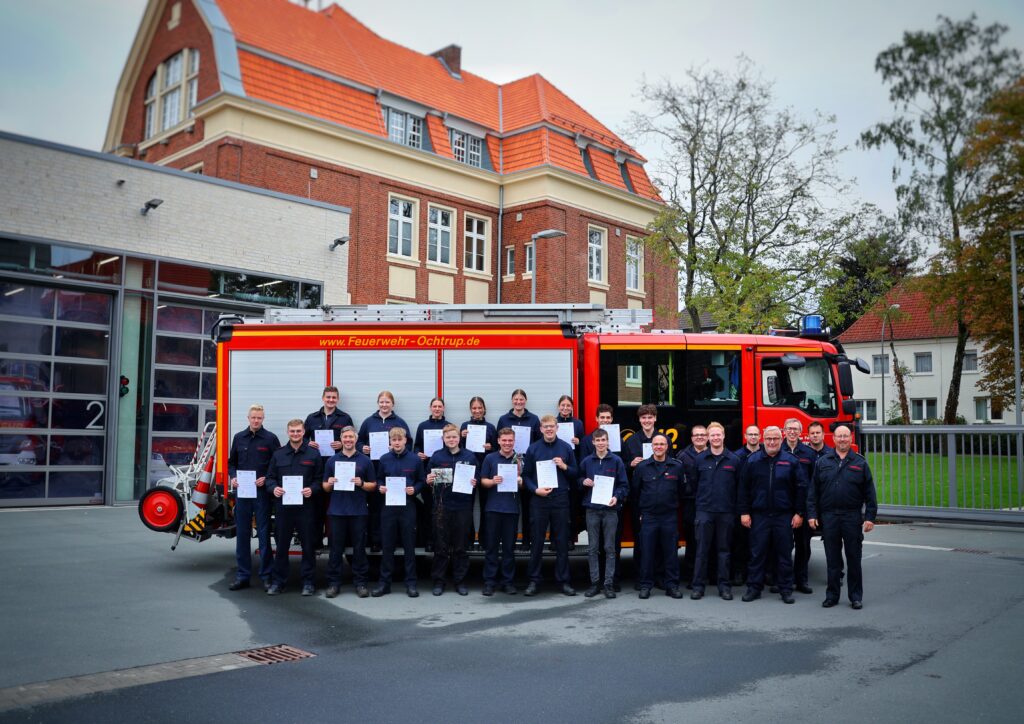 Rund 180 Ausbildungsstunden, verteilt auf knapp 40 Lehrgangstage – und das zusätzlich zum regulären Einsatz- und Übungsdienst: Was nach einem straffen Programm klingt, haben 16 engagierte Feuerwehrkameradinnen und -kameraden in den vergangenen Wochen und Monaten mit großem Einsatz gemeistert. Seit Ende August 2024 absolvierten sie gemeinsam mit ihren Ausbildern die umfangreiche Truppmannausbildung, die am letzten Samstag im September mit der erfolgreichen Abschlussprüfung am Gerätehaus in Ochtrup ihren Höhepunkt fand.