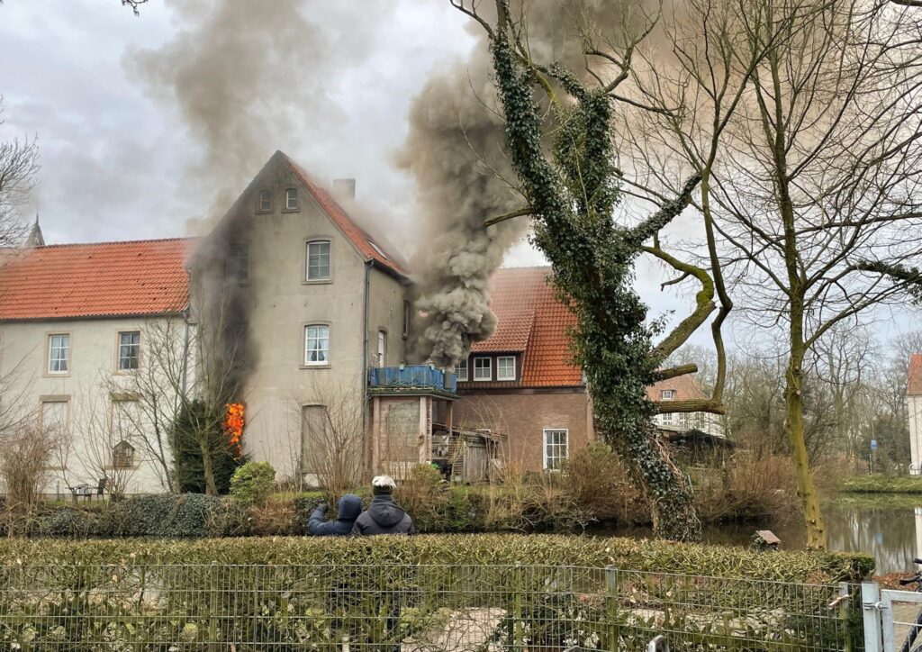Dramatischer Einsatz am Samstagnachmittag im Ortsteil Langenhorst: In einem älteren Einfamilienhaus innerhalb eines U-förmigen Reihenbaukomplexes brach im Bereich einer Sauna ein Feuer aus, das sich schnell ausbreitete. Beim Eintreffen der Feuerwehr machten sich zwei von Rauch und Flammen eingeschlossene Bewohner an einem Fenster bemerkbar. Beide Personen konnten über eine Steckleiter gerettet werden, anschließend wurde der Brand intensiv bekämpft