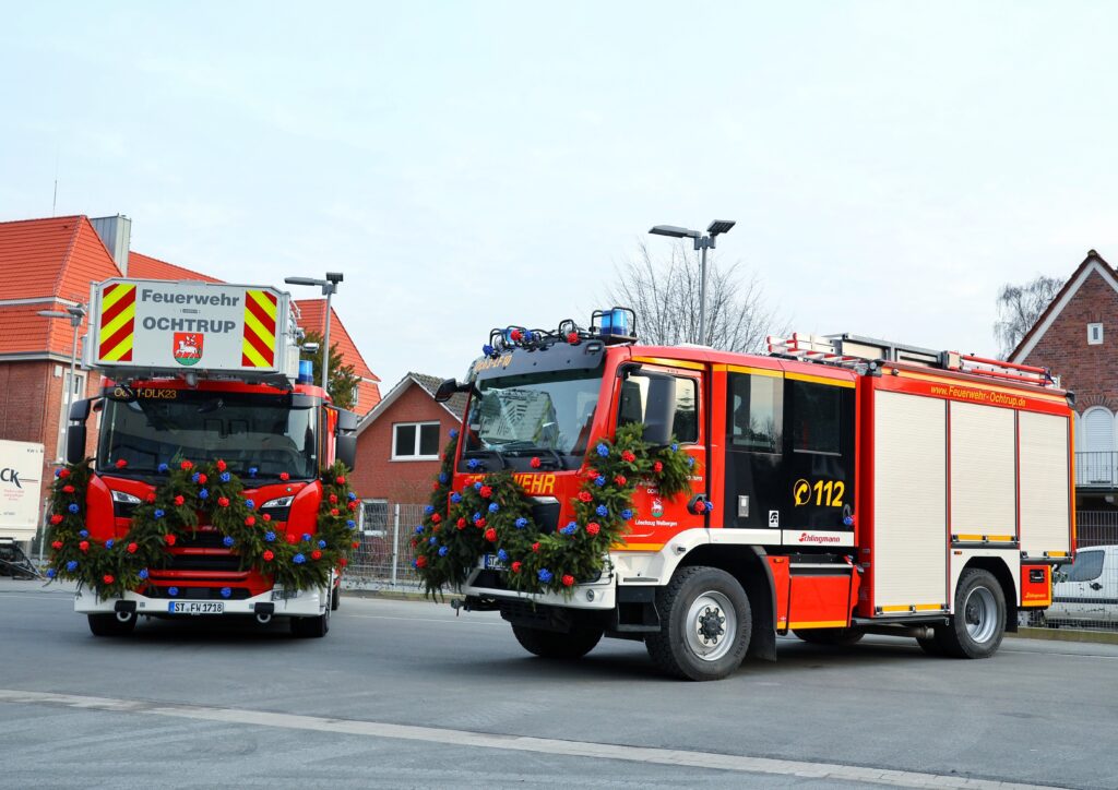 Stolz geschmückt mit überdimensionalen Girlanden in Tannengrün sowie rot-blauen Papierrosen standen Mitte Februar zwei neue Einsatzfahrzeuge der Feuerwehr Ochtrup – eine DLK 23/12 und ein LF 10 – auf dem Alarmhof am Spritzenhaus. Wer beim Vorbeigehen an erste Vorbereitungen für das Karnevalsfest dachte, irrte sich jedoch. Gemeinsam mit Vertretern der Ochtruper Kirchengemeinde wurden die beiden neuen Fahrzeuge feierlich eingeweiht. Im Anschluss lud die Leitung der Feuerwehr die Kameradinnen und Kameraden, sowie die geladenen Gäste zum gemütlichen Umtrunk in das Gerätehaus Ochtrup ein.