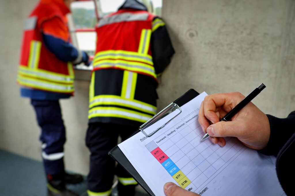 Für die 16 übrig gebliebenen Prüfungsteilnehmerinnen und -teilnehmer begann der Samstagmorgen – wie bereits bei der Zwischenprüfung Anfang des Jahres – mit einer theoretischen Klausur. Rund 45 Fragen aus den Bereichen Brandschutz, technische Hilfeleistung, Rechtsgrundlagen und weiteren Themenfeldern mussten beantwortet werden.