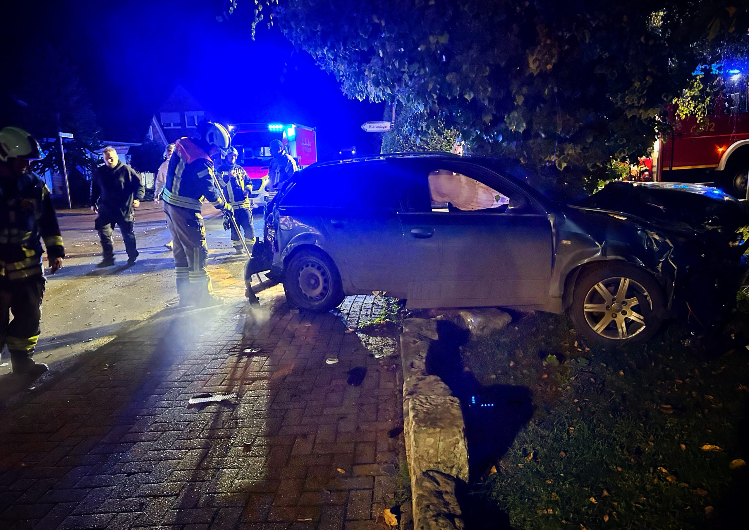 Beim Eintreffen der Feuerwehr an der Einsatzstelle bestätigte sich die initiale Meldung. Nach ersten Erkenntnissen befuhr ein Lkw die Schützenstraße in Fahrtrichtung Waldstraße/Industriegebiet. Zur gleichen Zeit befuhr ein mit drei Personen besetzter Pkw den Alt Metelener Weg aus Richtung der Weiner Bauerschaft kommend. Im Kreuzungsbereich Schützenstraße übersah der Fahrer des Pkw den herannahenden Lkw, sodass es zur Kollision beider Fahrzeuge kam. Der Pkw schleuderte in einen gegenüberliegenden Vorgarten und kam dort zum Stehen. Der Lkw geriet infolge der Kollision von der Fahrbahn ab, durchbrach eine Vorgartenmauer auf der gegenüberliegenden Straßenseite und kam rund 100 Meter weiter auf der Straße zum Stillstand.