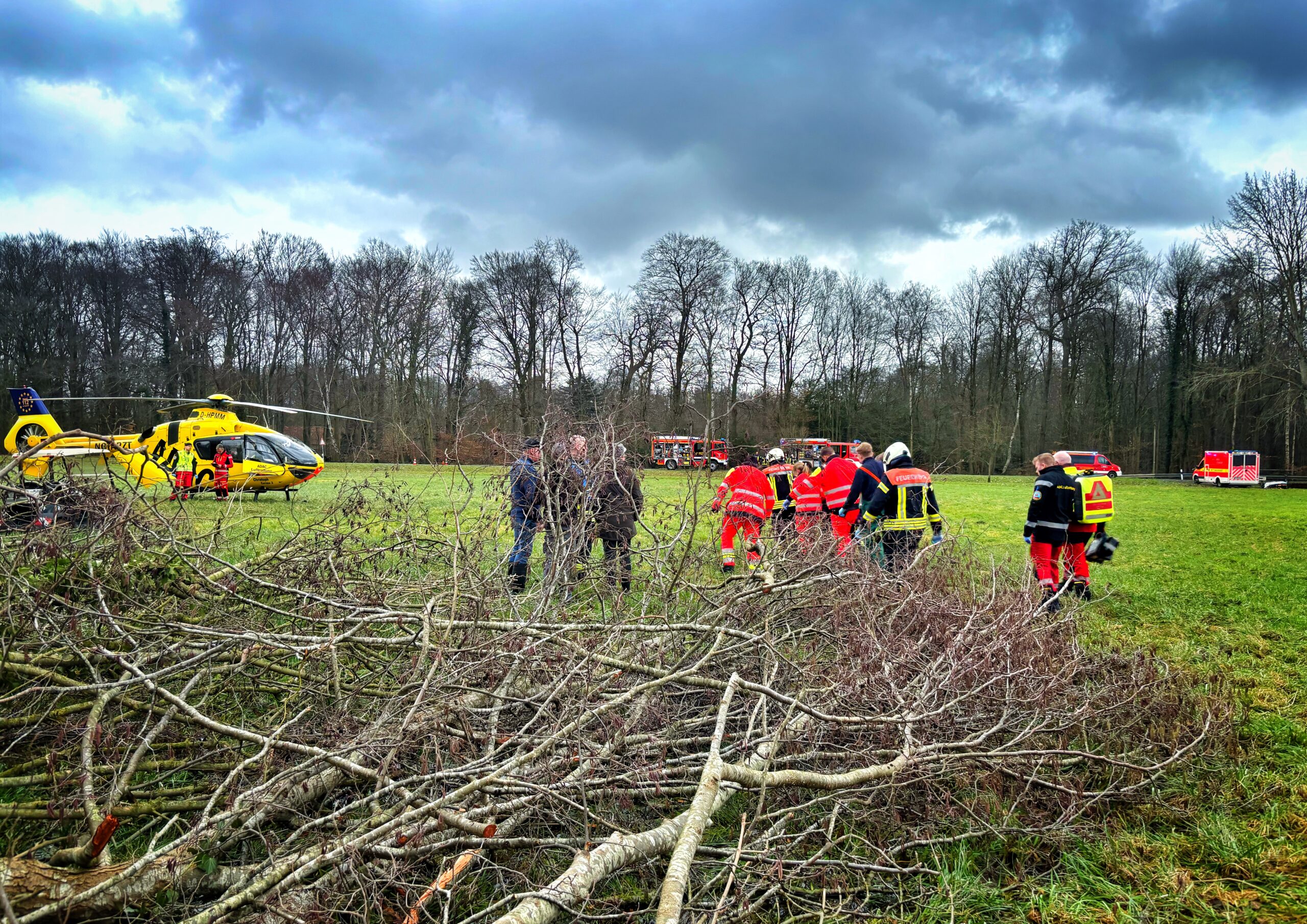 Vor Ort stellte sich heraus, dass ein Mann während Fällarbeiten im genannten Waldstück einen medizinischen Notfall erlitten hatte, was zur Alarmierung des Rettungsdienstes führte. Die Rettungskräfte versorgten den Mann zunächst an der Einsatzstelle. Aufgrund der schwierigen Auffindesituation – mitten zwischen mehreren gefällten Bäumen und langen Marschwegen im unwegsamen Gelände – forderte der Rettungsdienst zusätzlich einen Rettungshubschrauber sowie die Feuerwehr zur Unterstützung an.