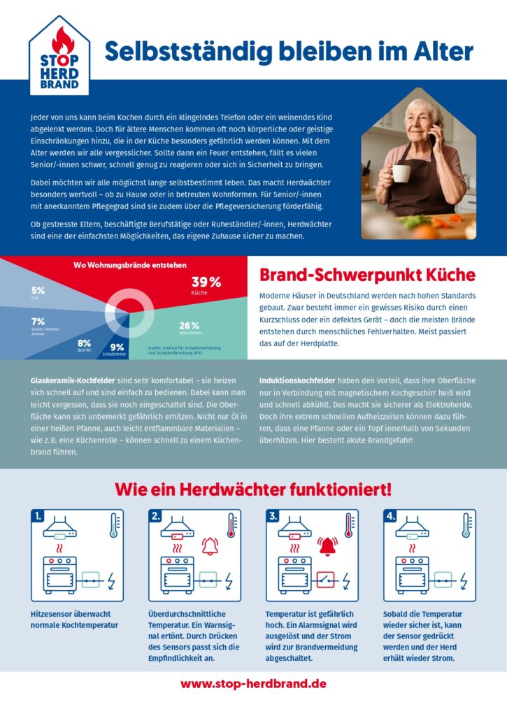 Zum internationalen Tag der älteren Menschen am 1. Oktober 2025 empfiehlt das Netzwerk für Brandschutz in der Küche zur Vorbeugung von Bränden den Einbau von sogenannten Herdwächtern in den Küchen älterer oder pflegebedürftiger Menschen. Das System besteht aus einem intelligenten Sensor, der über dem Kochfeld angebracht wird und einer Steuereinheit, die im Ernstfall den Herdstromkreis unterbricht. Der Sensor erkennt Risikosituationen wie Überhitzung, angebranntes Essen oder vergessene Kochplatten und schaltet im Ernstfall automatisch den Herd ab. So wird ein möglicher Brand verhindert, bevor er überhaupt entstehen kann. Anders als Rauchmelder, die im Brandfall Alarm schlagen, wirken Herdwächter präventiv.