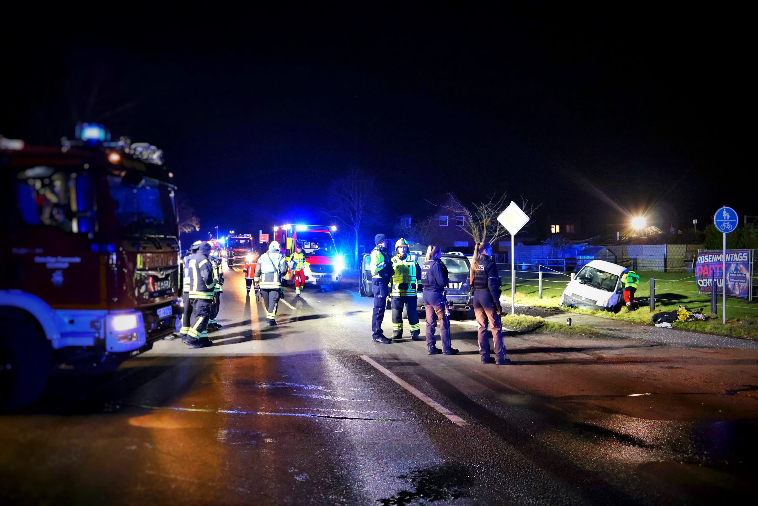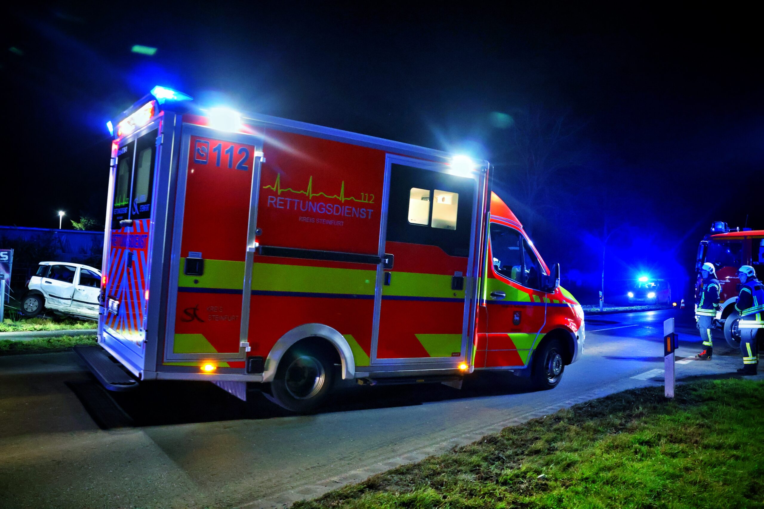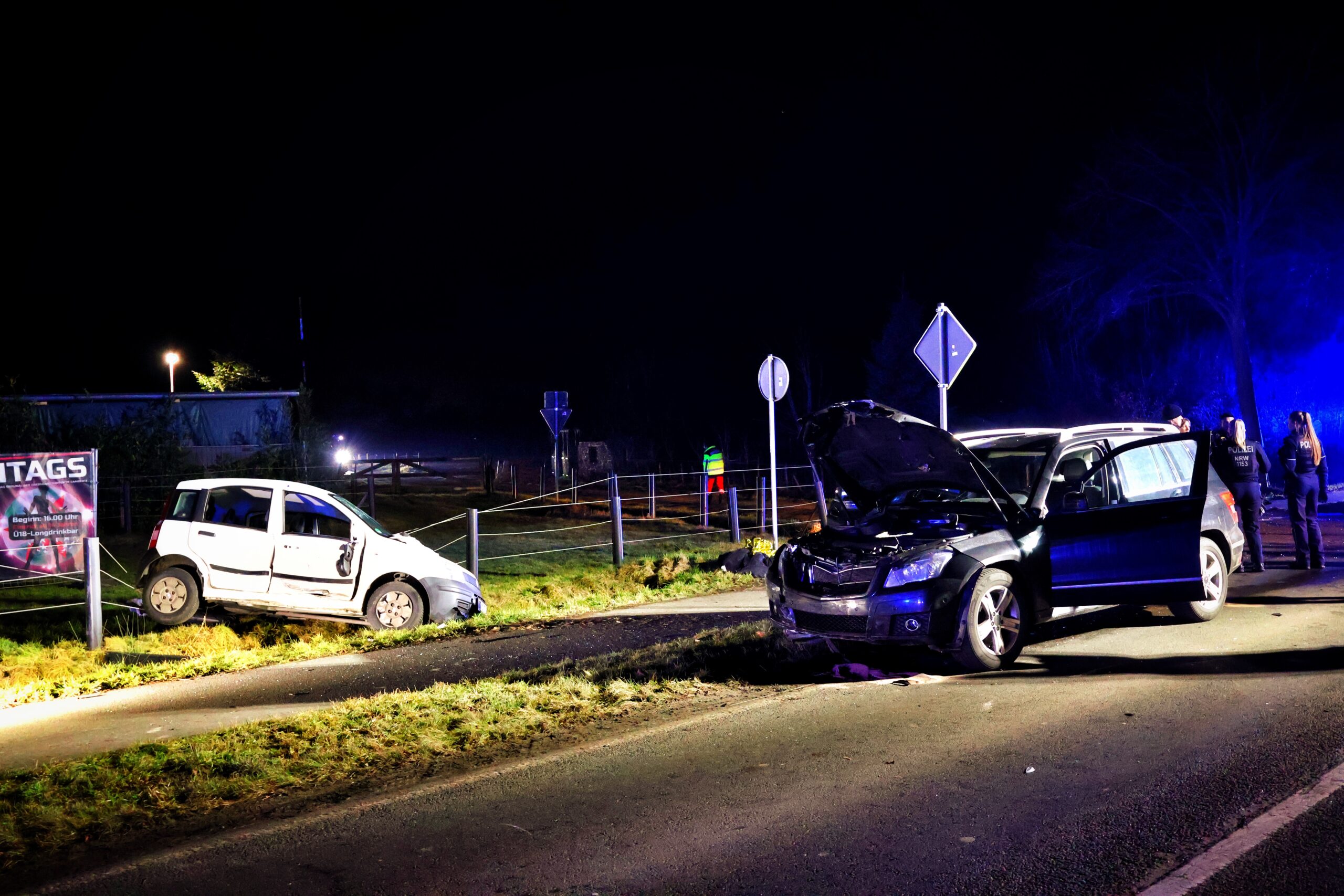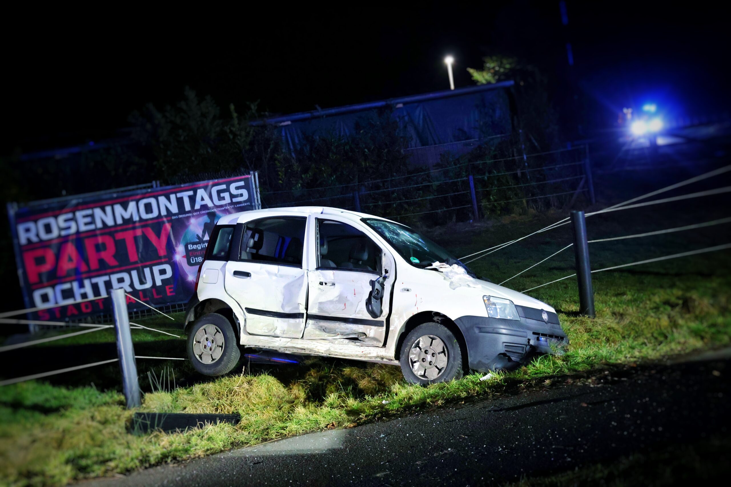 Bei Eintreffen der ersten Kräfte von Rettungsdienst und Feuerwehr an der Einsatzstelle bestätigte sich die initiale Meldung jedoch nur in Teilen. Nach ersten Erkenntnissen der Polizei befuhr ein mit drei Personen besetzter Mercedes die Gronauer Straße in Fahrtrichtung Ochtrup. Ein mit einer Person besetzter Fiat beabsichtigte zur gleichen Zeit, die Gronauer Straße aus Richtung „Am Hang“ kommend in die Weiner Bauernschaft zu überqueren. Hierbei kam es zum Zusammenstoß beider Fahrzeuge, wobei der Fiat in einen parallel zur Fahrbahn verlaufenden Graben geschleudert wurde.